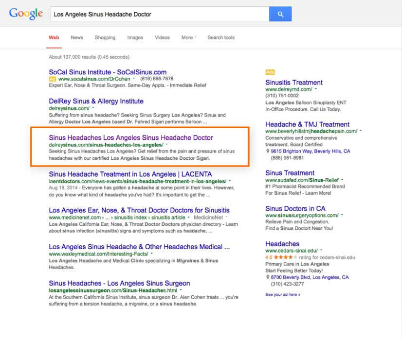 A unique link building process and the distribution of content from third party profiles. To help create social authority on the web, we created custom doctoral infographics that helped users who were looking for 5 reasons, top 10 list, or other informative facts about under-going procedures from ENT Doctors. These are unobtrusive ways to generate traffic to your website in credible locations. To help with the content we create a graphic communication flow within the infographics and videos that we submit to help clearly show why our ENT Doctor is the best choice for their clientele. As you can see, we produce content, info graphics, business reviews and ongoing content distribution on a weekly basis. This helps our ENT doctor rank on the 1st page of Google. Once your peer groups and local communities view you as the king of content, or the best source for information, Google will rank your local listing and website on the 1st page of Google as the best ENT Doctor in Los Angeles, or other targeted locations. Our SEO Company California can manage multiple ENT Doctors around the United States because we only take on two clients per listing.