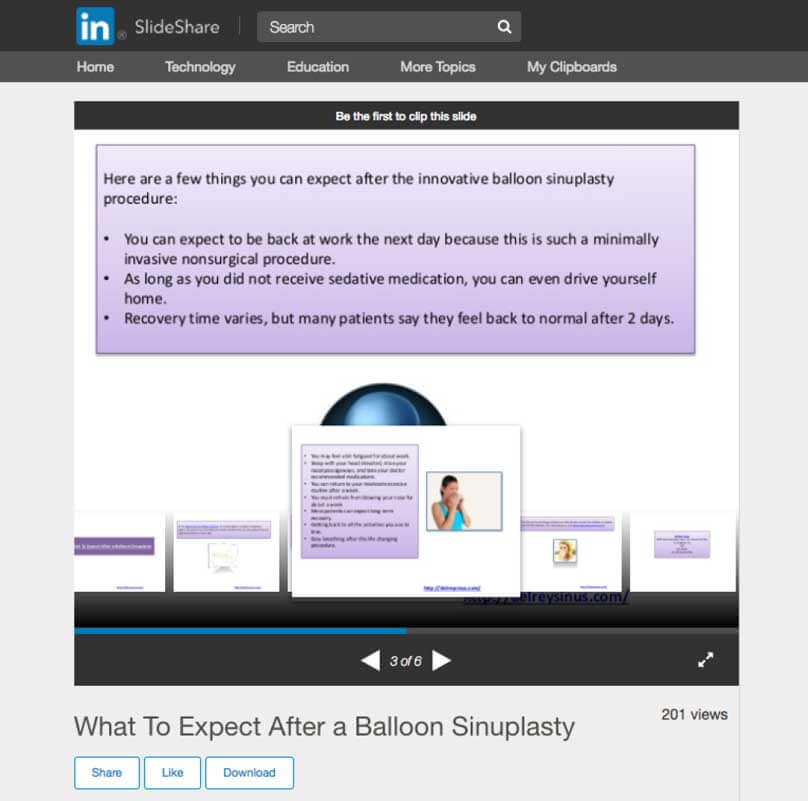 Noxster manages and works with our medical ENT Doctors to promote and stimulate organic links and read rates. This example is a post on LinkedIn that generated over 201+ reads. Every single piece of content that is distributed will generate an organic response rate that is identical to the value of referral site traffic. Within Analytics we will monitor direct and refer all traffic sources. Noxster will count the number of third party read rates that our content has generated on a monthly basis. Custom Link Building Strategy includes the delivery of Lifestyle marketing content. This strategy ensures that your ENT website is generating an organic amount of referrals, reads and shares. If your website does not have people referencing content, services or information, Google is not going to find it as a top 10 company on page 1. Our SEO Consulting and Strategic Implementation Strategy creates a share rate in alignment with how humans refer other doctors through word of mouth style communication. This third party SlideShare was uploaded on LinkedIn and openly shared information on 5 fun facts of “What to Expect After a Balloon Sinuplasty.” This one upload has generated over 200+ unique views and reads.